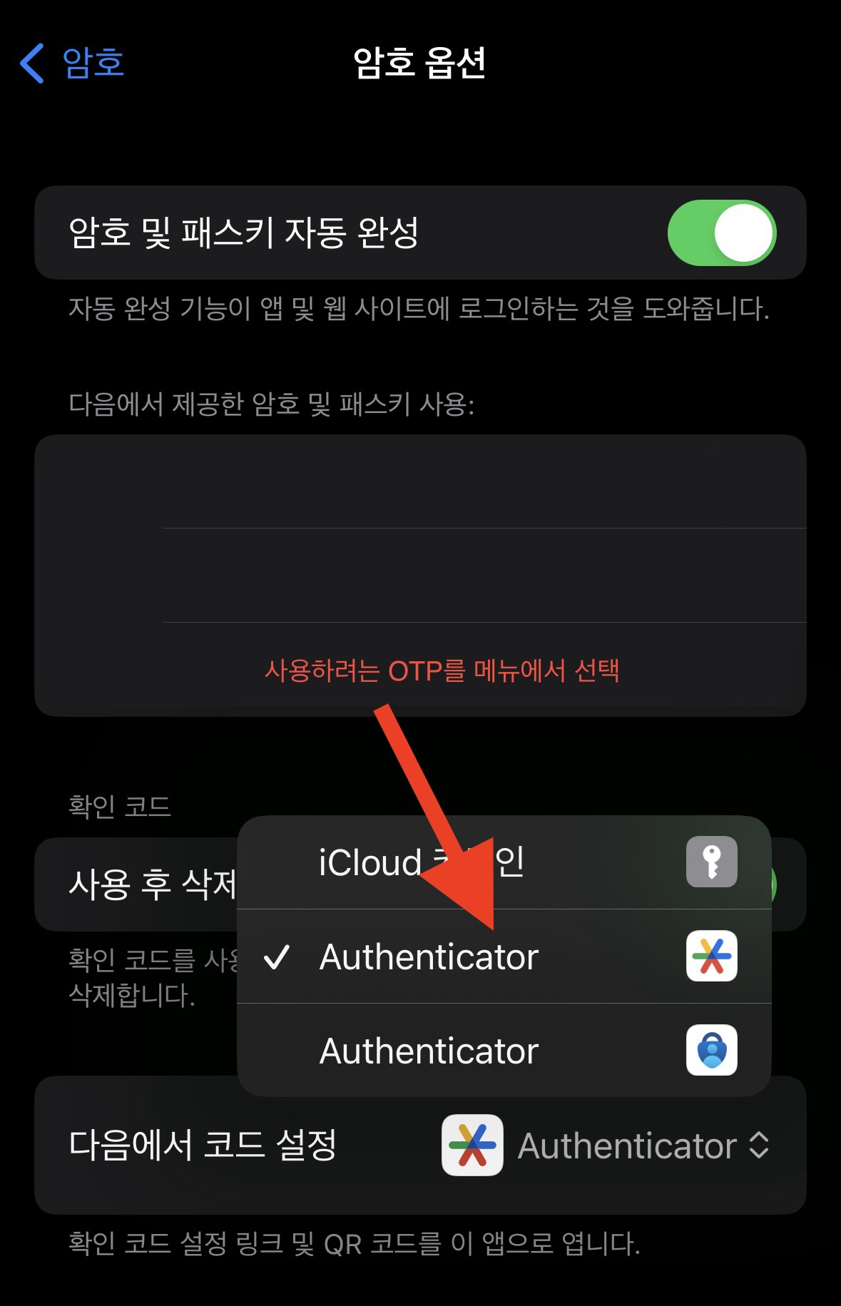 여기서 '다음에서 코드 설정'을 선택하셔서 새로 설치한 구글의 Authenticator를 선택하시면 됩니다.