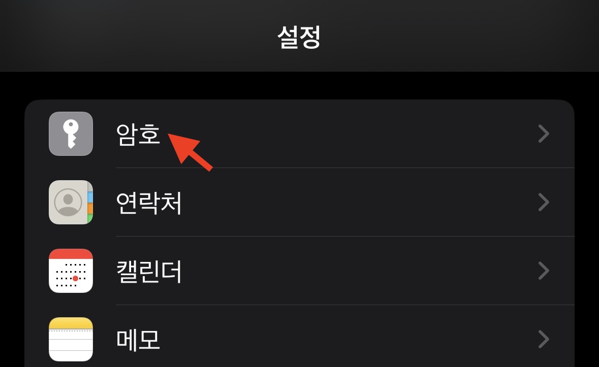 아래로 스크롤하여 설정 메뉴에서 '암호'를 선택합니다.\[IOS17]