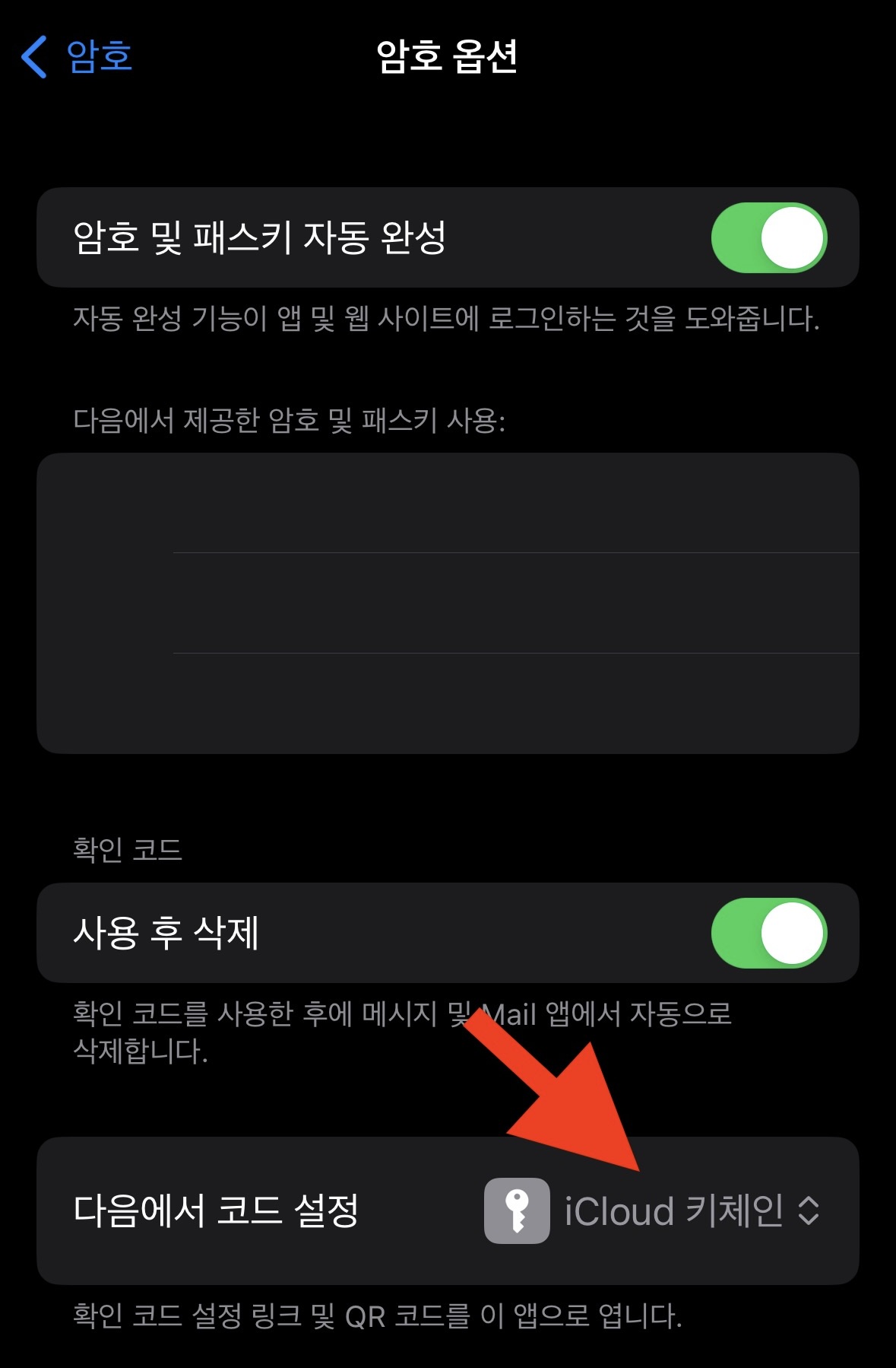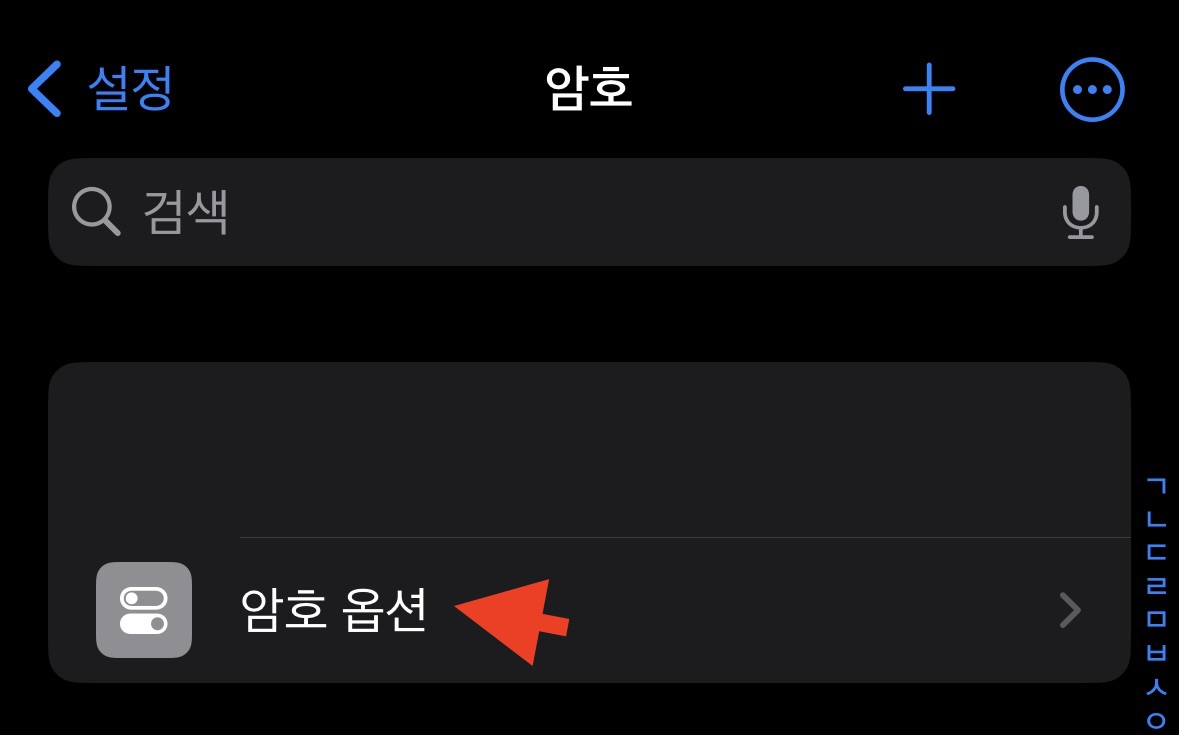 '암호' 메뉴에서 '암호 옵션' 버튼을 누릅니다.\[IOS17]