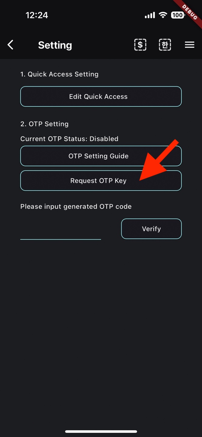 3. Request OTP key를 눌러 OTP를 등록. 할 수 있게합니다.
